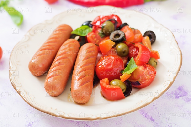 Колбаски на гриле с овощами