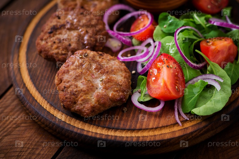 Аппетитные мясные котлетки и томатный салат с рукколой