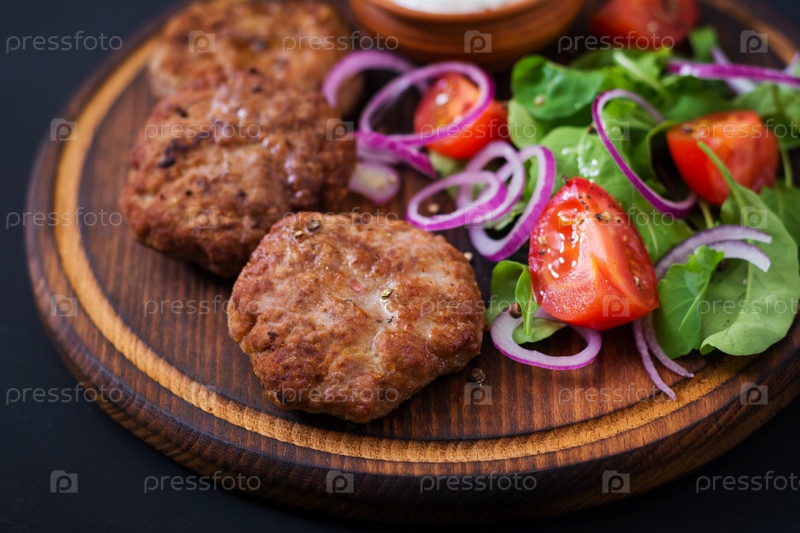 Аппетитные мясные котлетки и томатный салат с рукколой