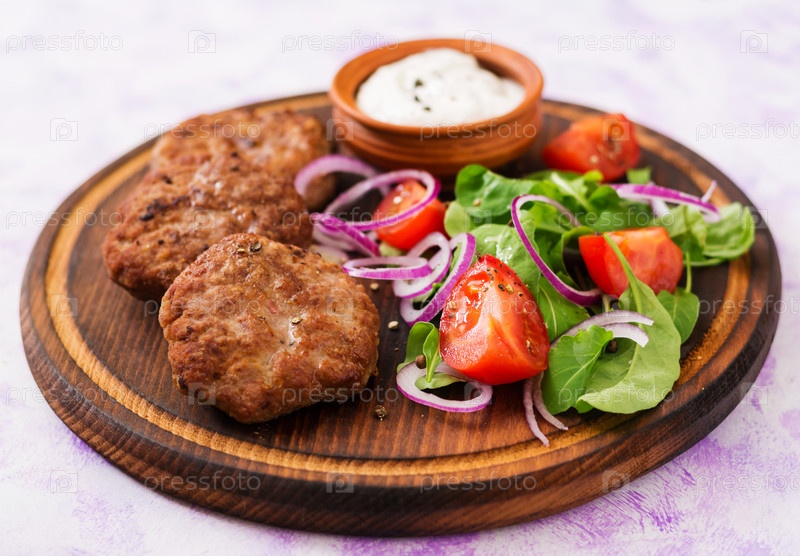 Аппетитные мясные котлетки и томатный салат с рукколой