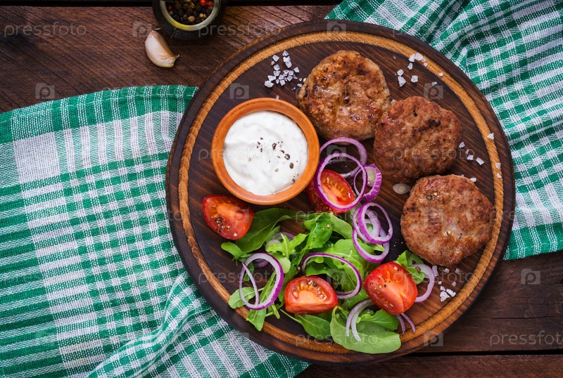 Аппетитные мясные котлетки и томатный салат с рукколой