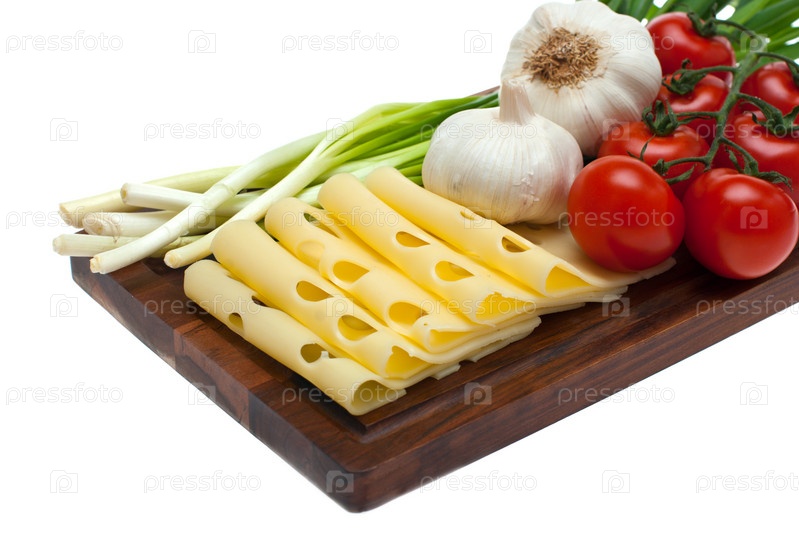 Сыр, чеснок, лук на белом фоне