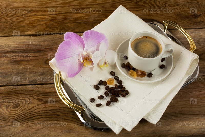 Чашка кофе с орхидеями