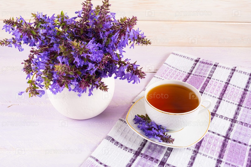 Чашка чая и фиолетовые цветы