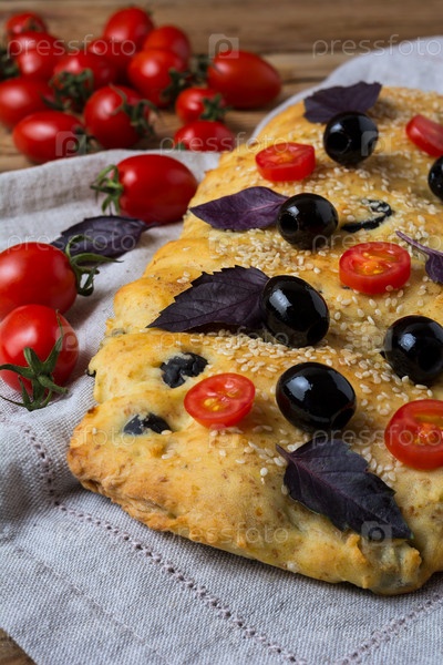 Итальянский хлеб фокачча с оливками, базиликом и помидорами черри