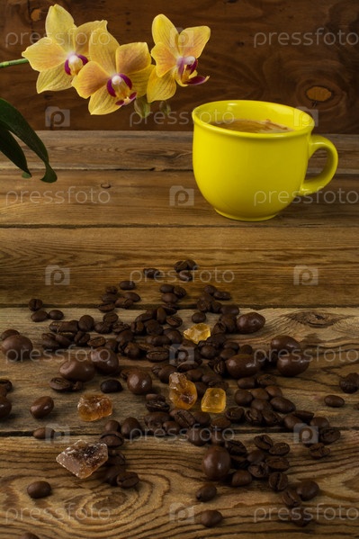 Чашка кофе и орхидеи