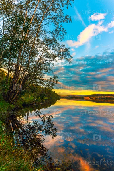 Закат с красочными облаками над озером