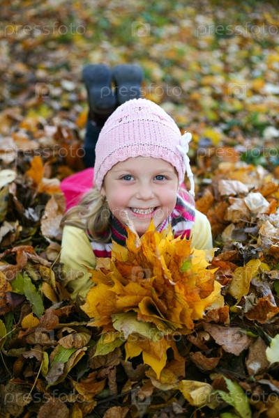 Девочка с желтыми листьями в осеннем парке