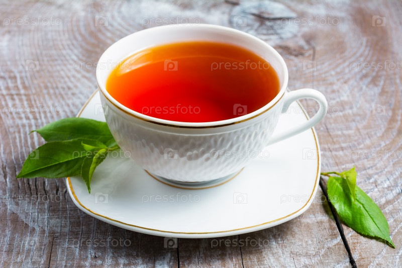 Чашка чая с зелеными листьями