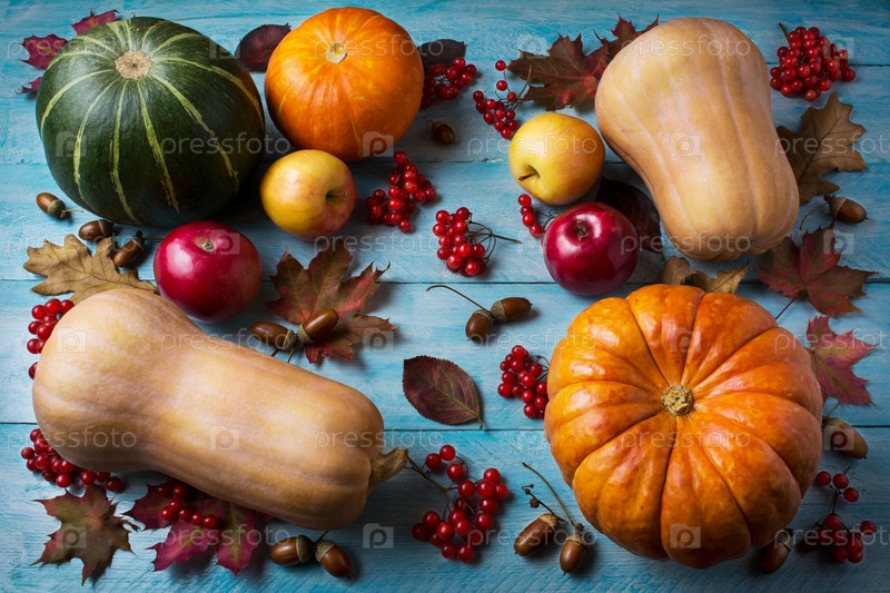 Осенний фон с тыквами, яблоками и ягодами