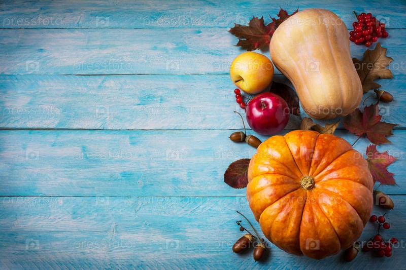 Осенний фон с тыквами, яблоками и ягодами