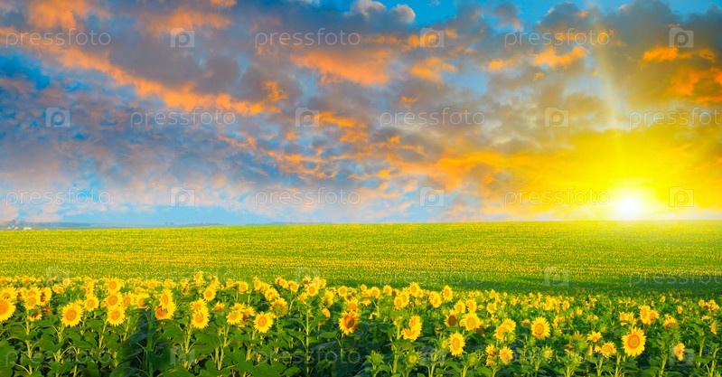 Поле подсолнухов и восход солнца