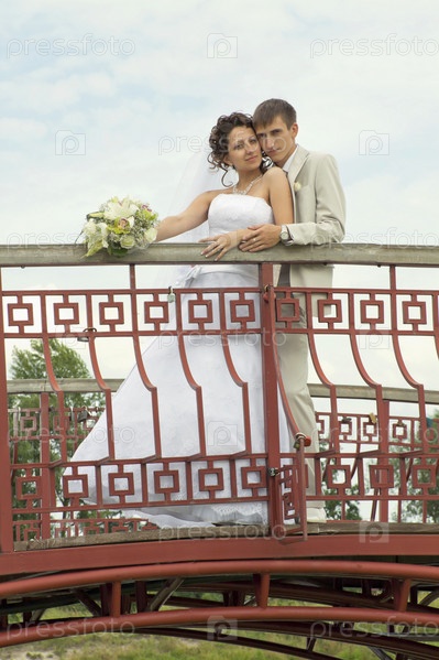 Жених обнимает невесту на мосту