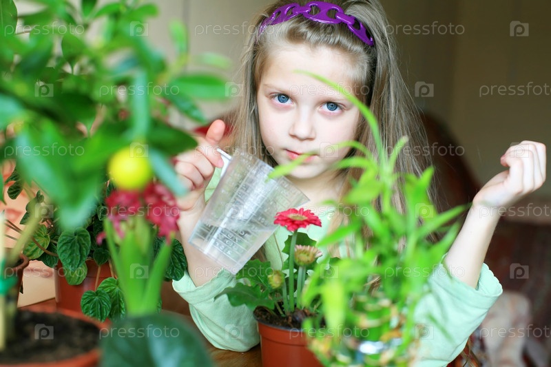 Девочка поливает цветы