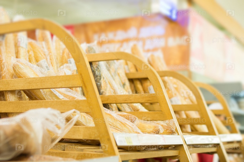 Ассортимент хлеба на полке в супермаркете