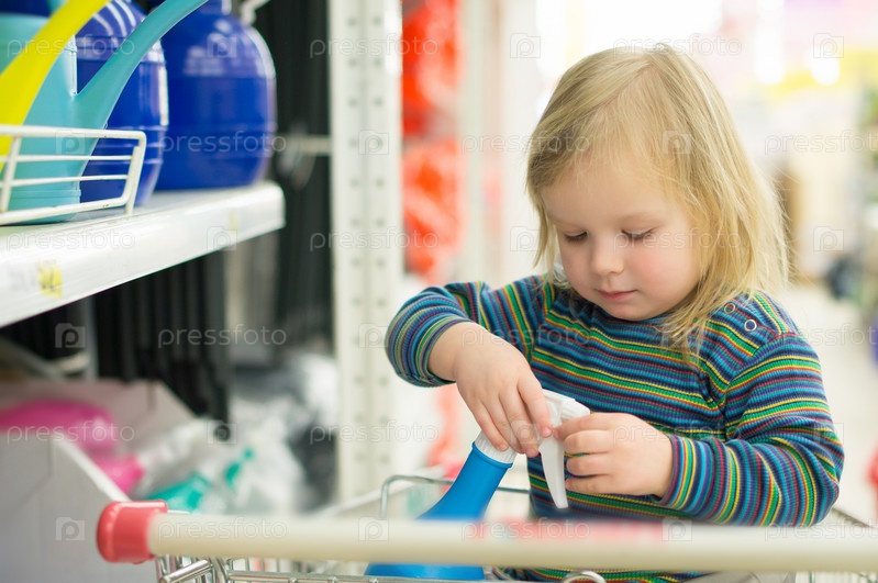 Маленькая девочка смотрит товары для садоводства в магазине