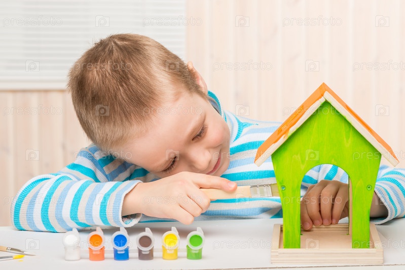 Маленький мальчик делает красивую кормушку для птиц