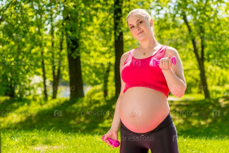 Активная беременная женщина с гантелями