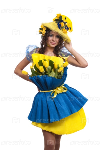 Элегантная модель с розами в шляпе и с тюльпанами, гвоздикой в платье от упаковки