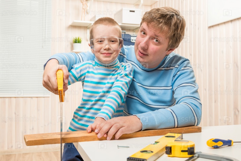 Отец учит своего сына плотницким работам