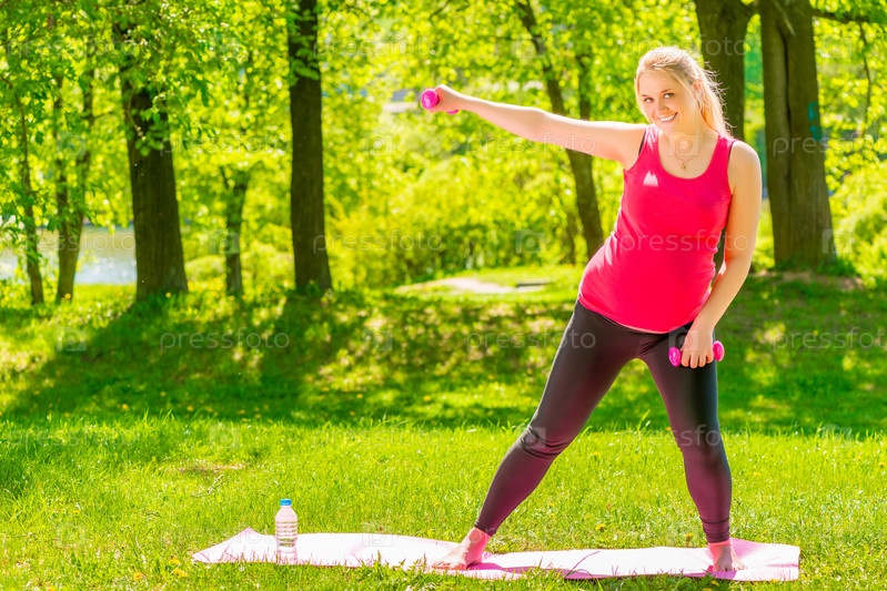 Беременная женщина с гантелями