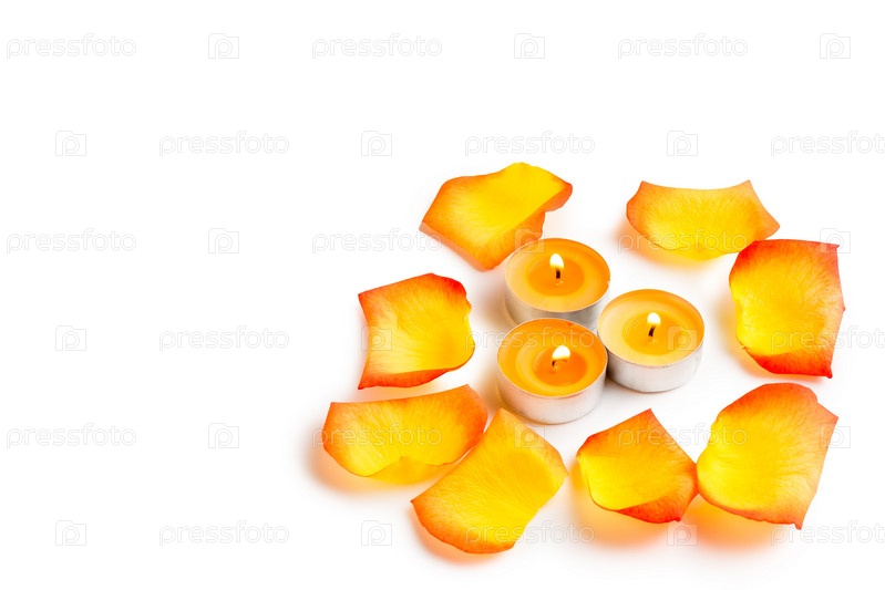 Зажженные свечи в окружении лепестков розы