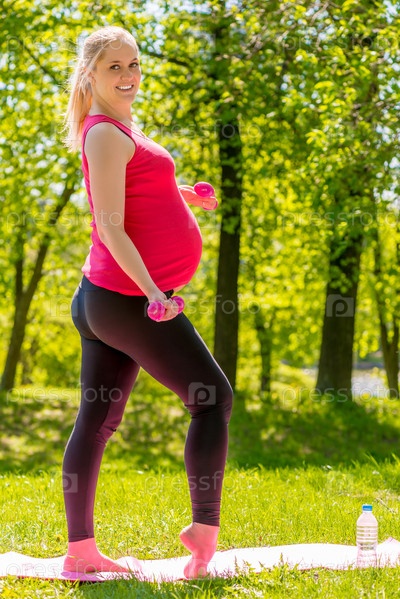 Беременная женщина с гантелями