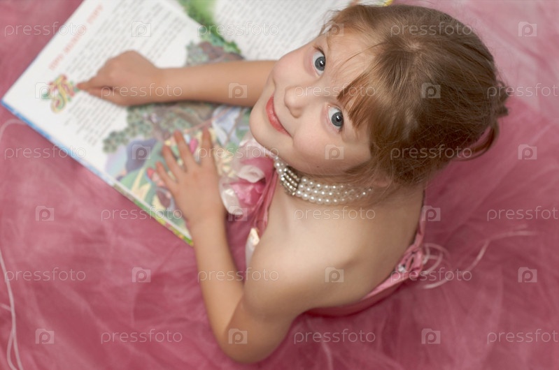 Девочка в розовом платье читает книгу