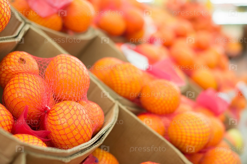 Апельсины в коробках в супермаркете