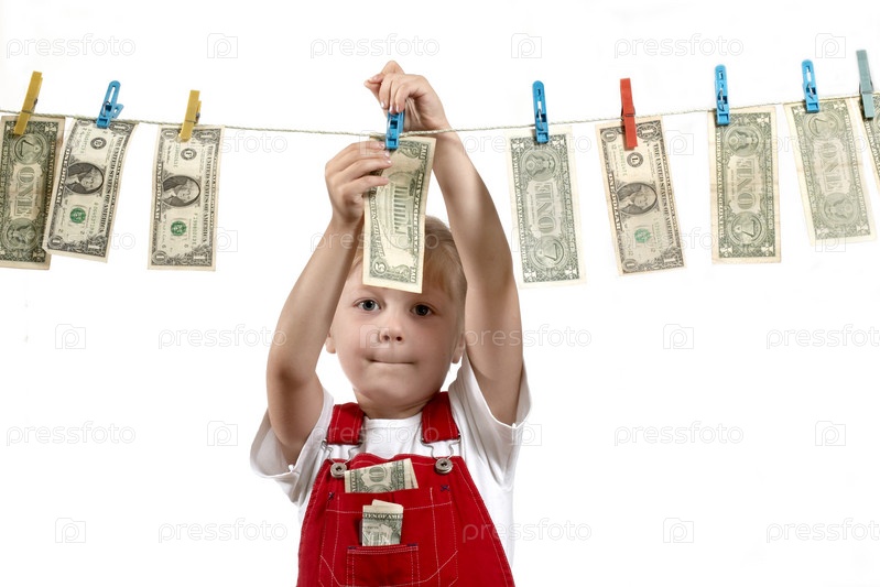 Девочка развешивает доллары на веревку