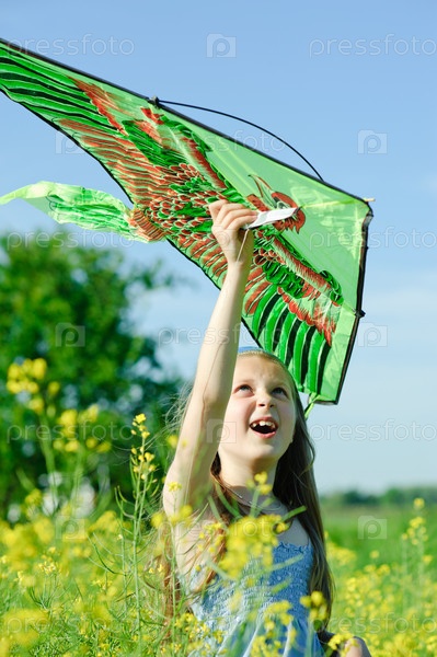 Счастливая девочка с воздушным змеем в летнем поле