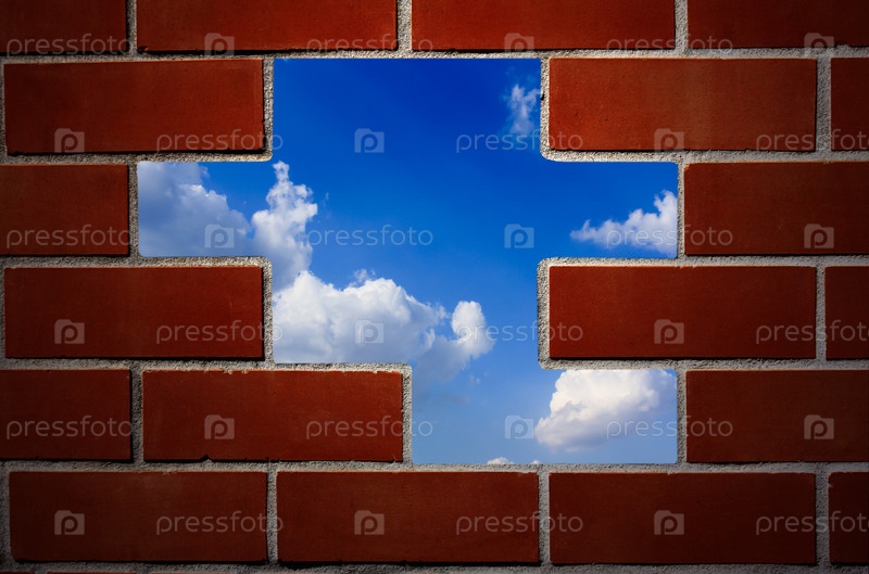 Кирпичная стена и голубое небо с облаками