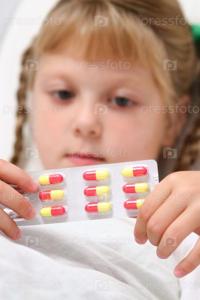 Больная девочка в постели с таблетками в руках
