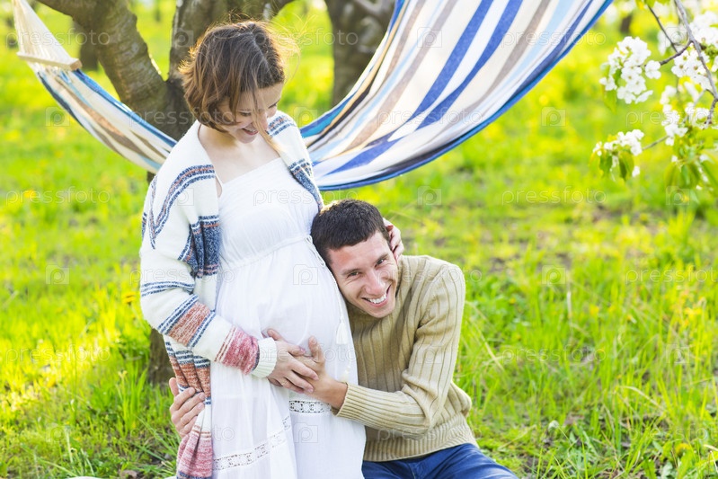 Счастливая беременная пара в цветущем саду