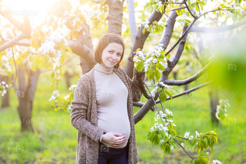 Красивая беременная женщина в цветущем саду