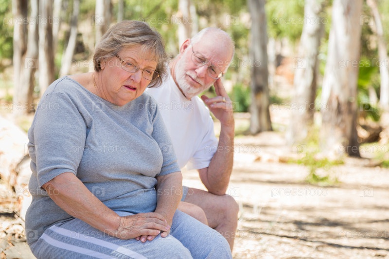 Расстроеная пожилая женщина с мужем на открытом воздухе