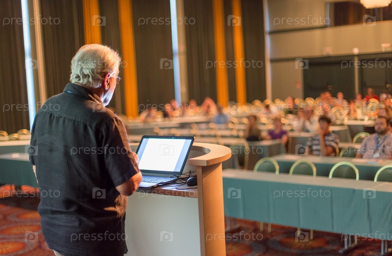 Пожилой оратор на научной конференции