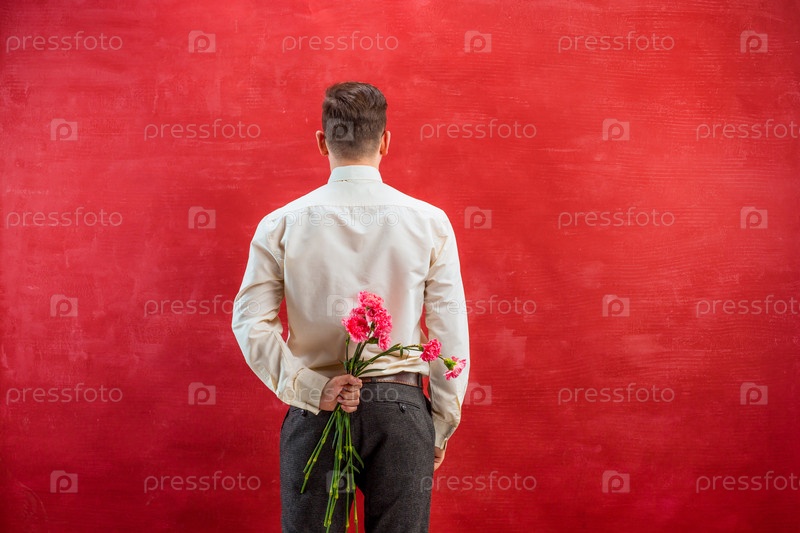 Парень с букетом гвоздик за спиной
