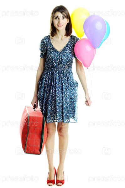 Молодая красивая женщина с воздушными шарами и чемоданом