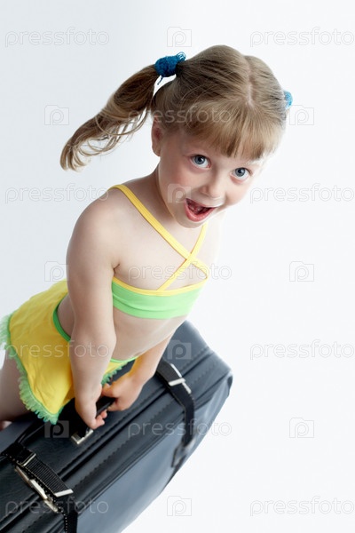 Девочка пытается поднять большой чемодан
