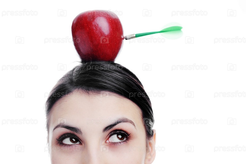 Портрет красивой молодой женщины с яблоком на голове