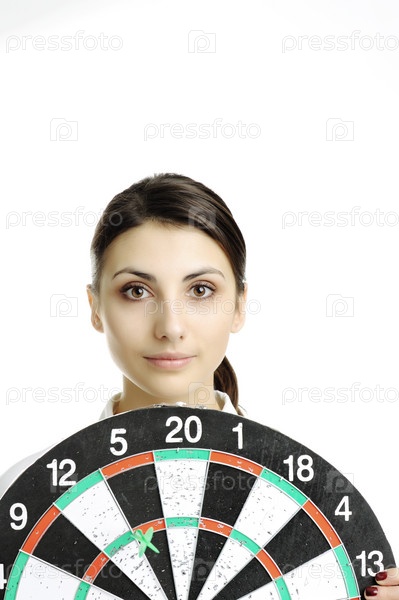 Молодая женщина держит мишень для дротиков