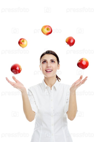 Молодая женщина жонглирует яблоками