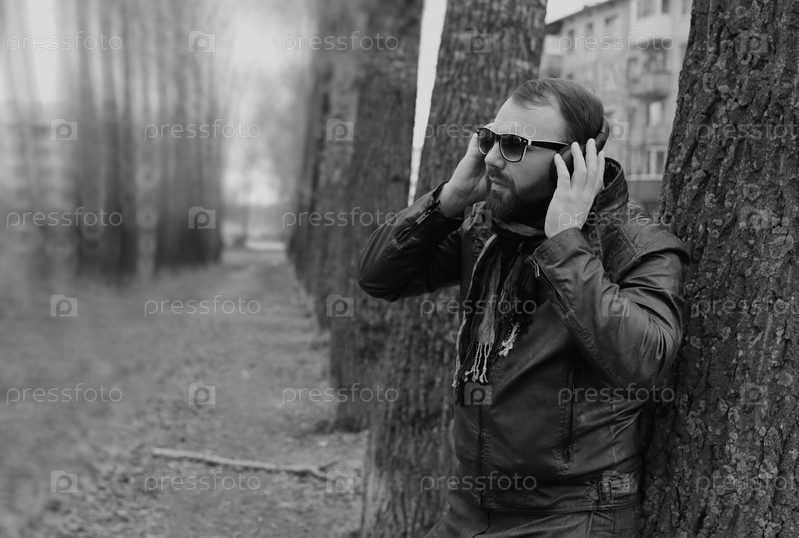 Мужчина слушает музыку в парке