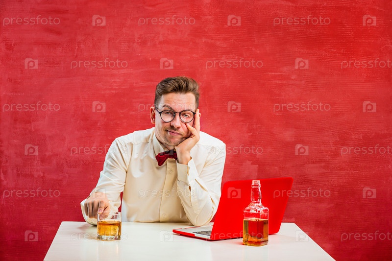 Мужчина с коньяком за ноутбуком