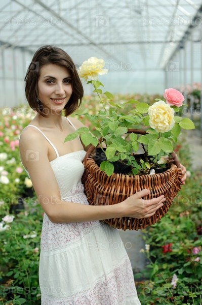 Девушка с корзинкой цветов в оранжерее