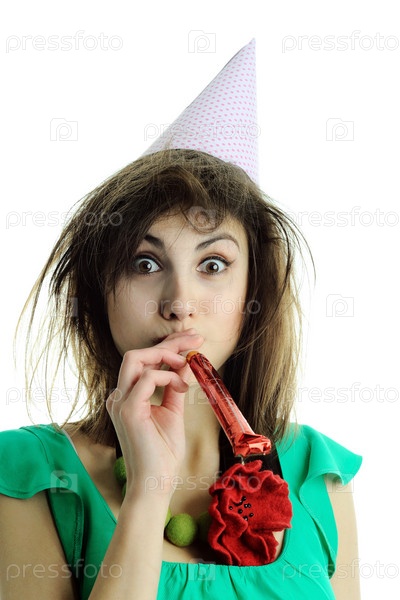 Молодая женщина с праздничным свистком