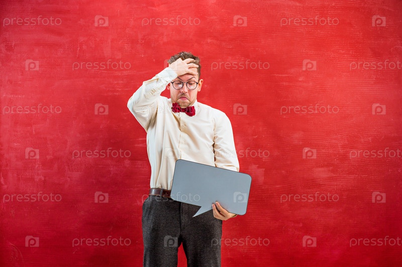 Забавный парень с пустой табличкой для цитаты