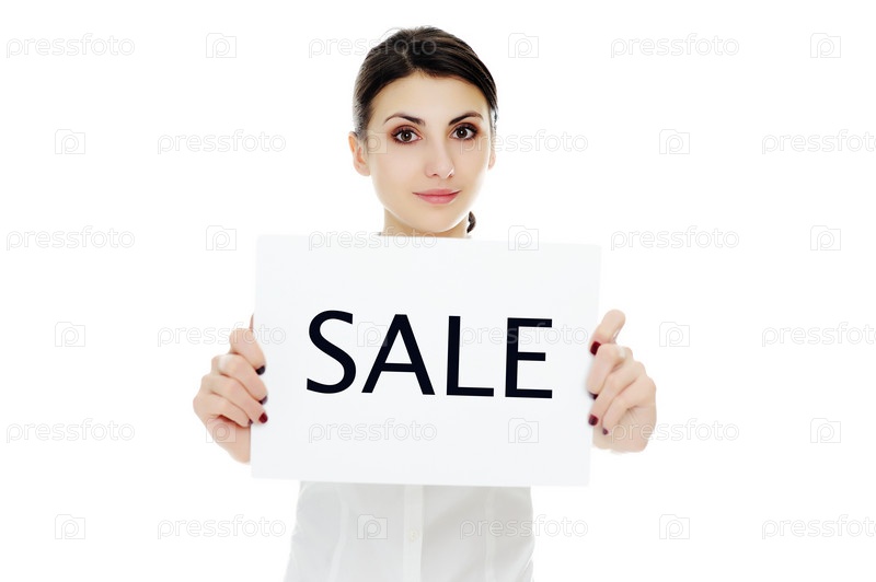 Молодая женщина держит лист с надписью "распродажа"