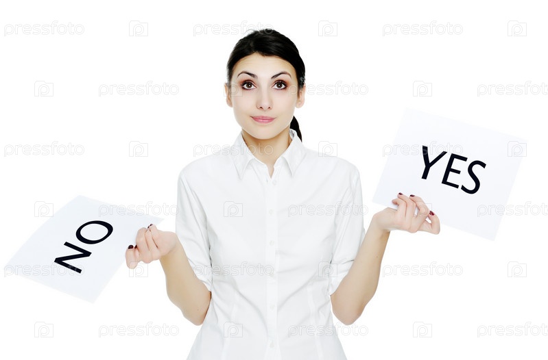 Молодая женщина держит два листа в руках с надписями "да" и "нет"